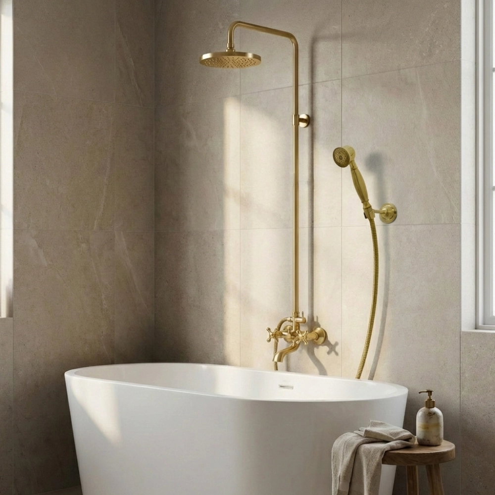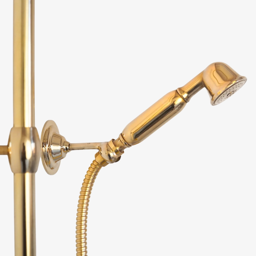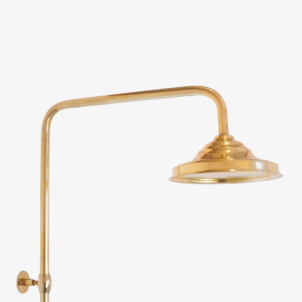Its traditional silhouette, warm unlacquered brass, and balanced proportions create a shower system that feels familiar, calm, and enduring. Designed to age naturally, it develops a patina that reflects daily use and time.